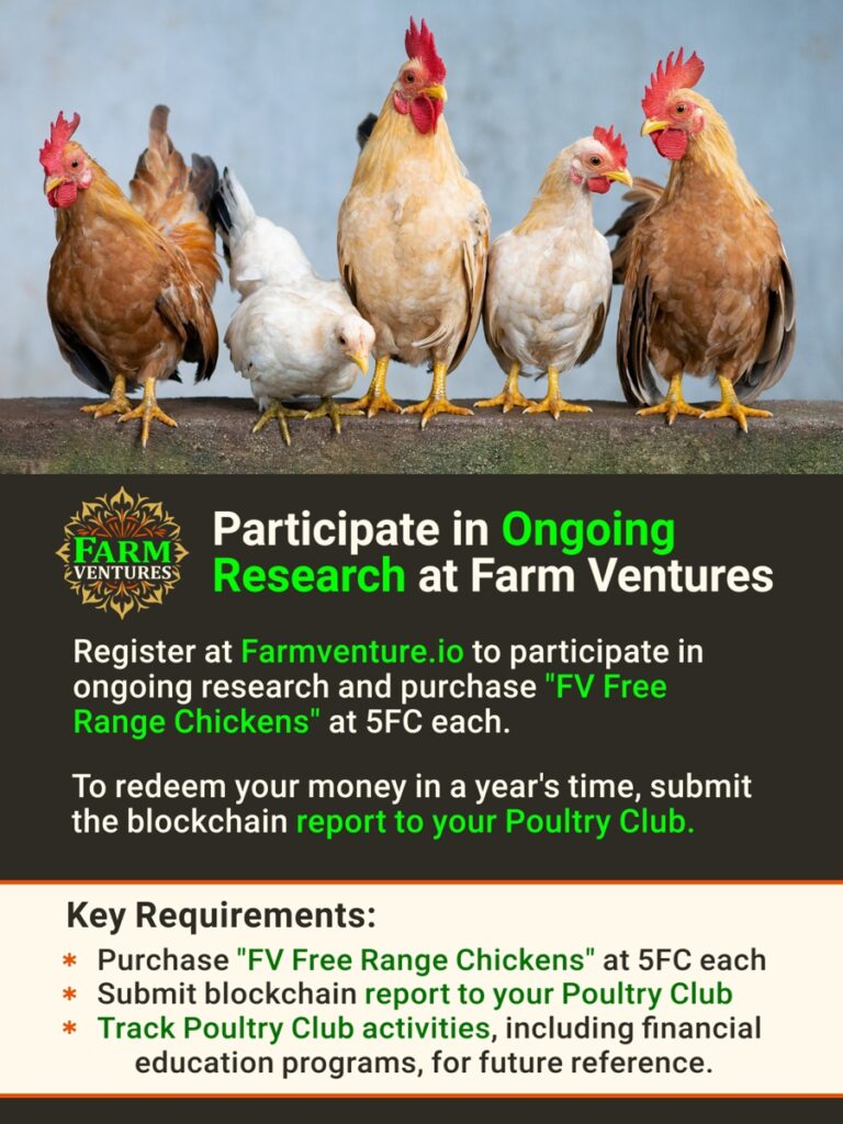 Register on the Venture Blockchain @ Farmventure.io to participate in ongoing research and purchase “VA Free Range Chickens” at 5FC each. To redeem your money in a year’s time, submit the blockchain report to your Poultry Club.